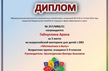 Гайнуллина Арина заняла 2 место во всероссийской викторине для детей с ОВЗ «Математика в быту». Возрастная группа: учащиеся 5-9 классов Руководитель: Хуснетдинова Венера Анасовна. Организатор «ТОМСКИЙ ГОСУДАРСТВЕННЫЙ ПЕДАГОГИЧЕСКИЙ УНИВЕРСИТЕТ»