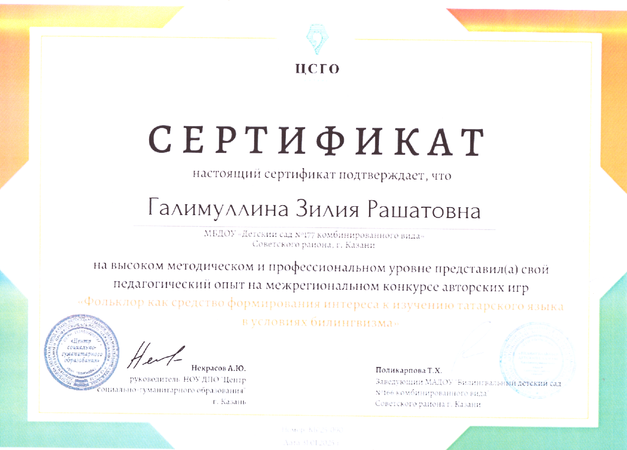 Воспитатель по обучению детей татарскому языку приняла участие во втором республиканском научно- педагогическом конкурсе. Представила методическое пособие "Увлекательный ковёр" для закрепления лексических тем татарского языка. -