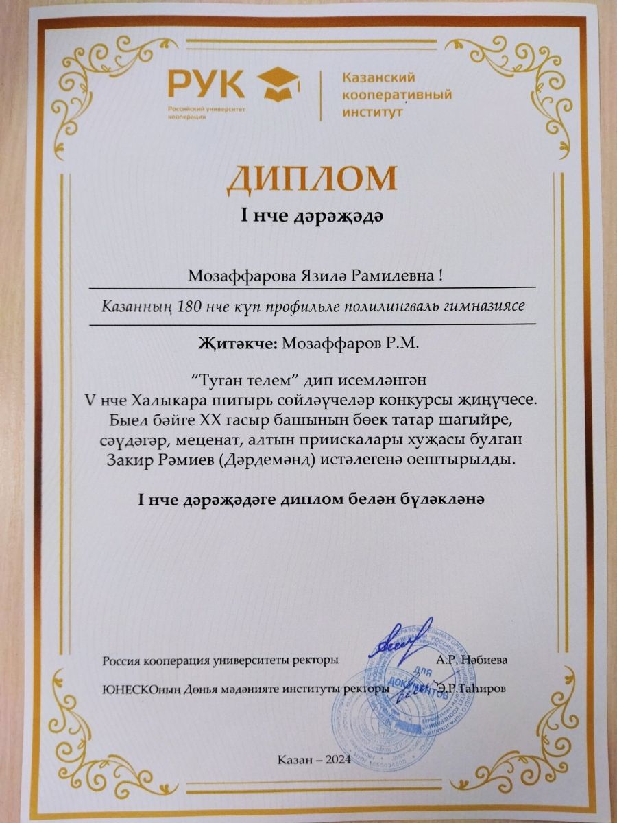 Бүген Казан кооператив институтының Татар мәдәнияте үзәгендә V Халыкара "Туган телем" шигырь конкурсына нәтиҗә ясалды. Быелгы бәйге күренекле татар шагыйре, иганәче, җәмәгать эшлеклесе Закир Рәмиев (Дәрдемәнд) истәлегенә багышланган иде. Гимназиябезнең 10 В сыйныфы укучысы Мозаффарова Язилә, әлеге конкурста уңышлы катнашып, беренче урынга лаек булды. Мозаффарова Язиләгә, укытучысы Рамил Мөдәрисовичка зур рәхмәтебезне җиткерәбез. Уңышлар, нык сәламәтлек телибез.