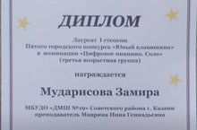 Ученица 3В класса Замира Мударисова под руководством Мавриной Инны Геннадьевны приняла участие в городском конкурсе "Юный клавишник" и стала лауреатом