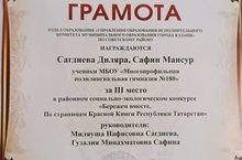Поздравляем учеников нашей гимназии Мансура Сафина из 6 и Диляру Сагдиеву из 5В класса! Мансур и Диляра заняли III место в районном социально-экологическом конкурсе «Бережём вместе. По страницам Красной книги РТ»!
