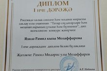 Ученица 9 Г класса нашей гимназии Музаффарова Язиля приняла участие на данном конкурсе. Её работа была посвящена известному татарскому поэту, меценату Дардменд. На заключительном этапе она успешно выступила и была награждена дипломом I степени. -