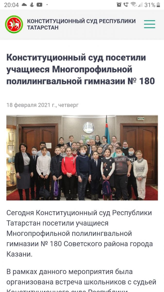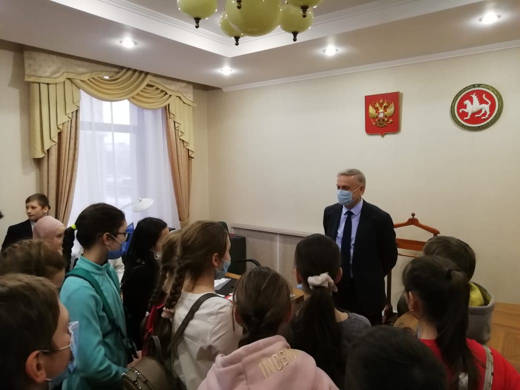 Парламентский урок , посвященный теме «2021 год - год родных языков и народного единства в Республике Татарстан" в нашей гимназии прошёл необычно! Учащиеся 5а, 5б, 5в класса посетили Конституционный суд Республики Татарстан. Начальник научно- аналитического отдела Конституционного суда Ильдаром Садыковым была обзорная экскурсия по зданию с посещением музеев суда, узнали, как жители республики могут защищать свои права, которые им гарантирует Конституция. Судья Марат Хайруллин выступил перед посетителями с ознакомительной лекцией, рассказал о деятельности Конституционного суда Республики Татарстан, познакомил с примерами из практики суда и ответил на заданные вопросы.