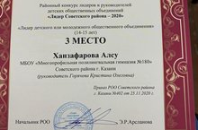 Сегодня нам присудили 3 место в районном конкусе "Лидер Советского района". Участница Ханзафарова Алсу, а руководитель Кристина Олеговна.