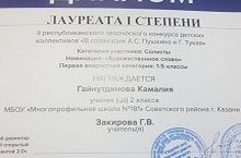 Ученица нашей школы Гайнутдинова Камалия стала лауреатом I степени II Республиканского творческого конкурса детских коллективов "В созвездии А.С.Пушкина и Г.Тукая". Руководитель Закирова Г.В.