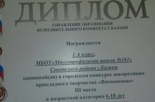 Учащиеся 1 А класса заняли 3 место в городском конкурсе декоративно-прикладного творчества " Вдохновение". Молодцы!