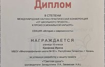 Поздравляем! Каюмову Ирину, ученицу 10А класса, с победой в международной научно-практической конференции "От школьного проекта - к профессиональной карьере" (секция "История и современность"), организованной международной кафедрой ЮНЕСКО.