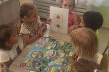Поэтому в течение недели воспитанники нашего детского сада участвовали в викторинах "Дорожная азбука", представляли себя в роли "Дорожного патруля" в автогородке, выполняли работы на тему "Наш друг светофор".
