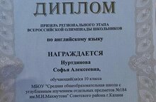 Нуртдинова Софья, ученица 10А класса стала призером регионального этапа Всероссийской олимпиады школьников по английскому языку. Руководитель: Полуэктова Мария Михайловна. Поздравляем!