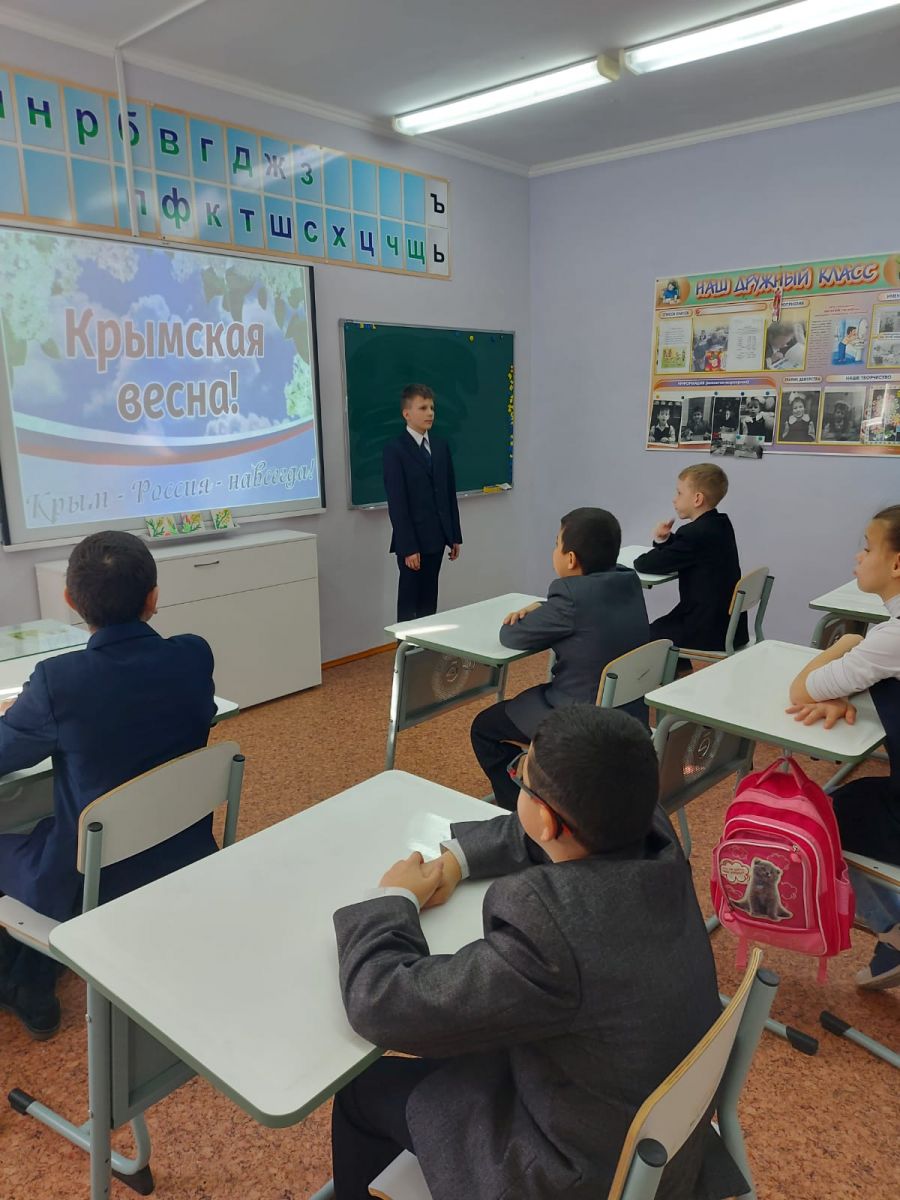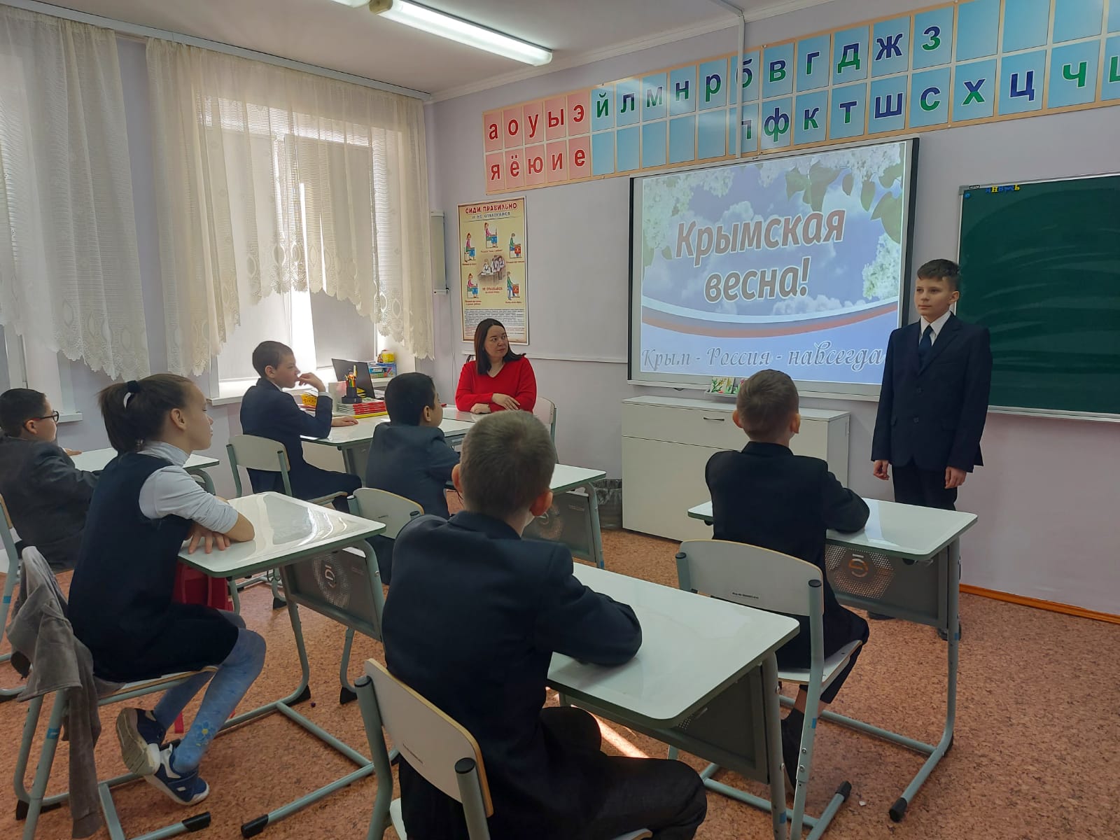 В ходе урока школьники познакомились с историей Крыма. Ребята узнали историю полуострова, о населяющих его народах, культурных и природных достопримечательностях. Поговорили о предпосылках, предшествующих возвращению Крыма, о референдуме и значимости этого события для жителей полуострова.
