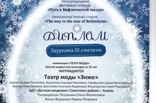 Театр моды педагогов "Энже" ЦДТ "Детская академия" (руководитель-костюмер Петрянина О.Ф.) приняли результативное участие в Международном фестивале-конкурсе "Путь к Вифлеемской звезде", став лауреатами 3 степени. Настоящим украшением номера стала песня в исполнении пдо по вокалу Федоровой Л.П.