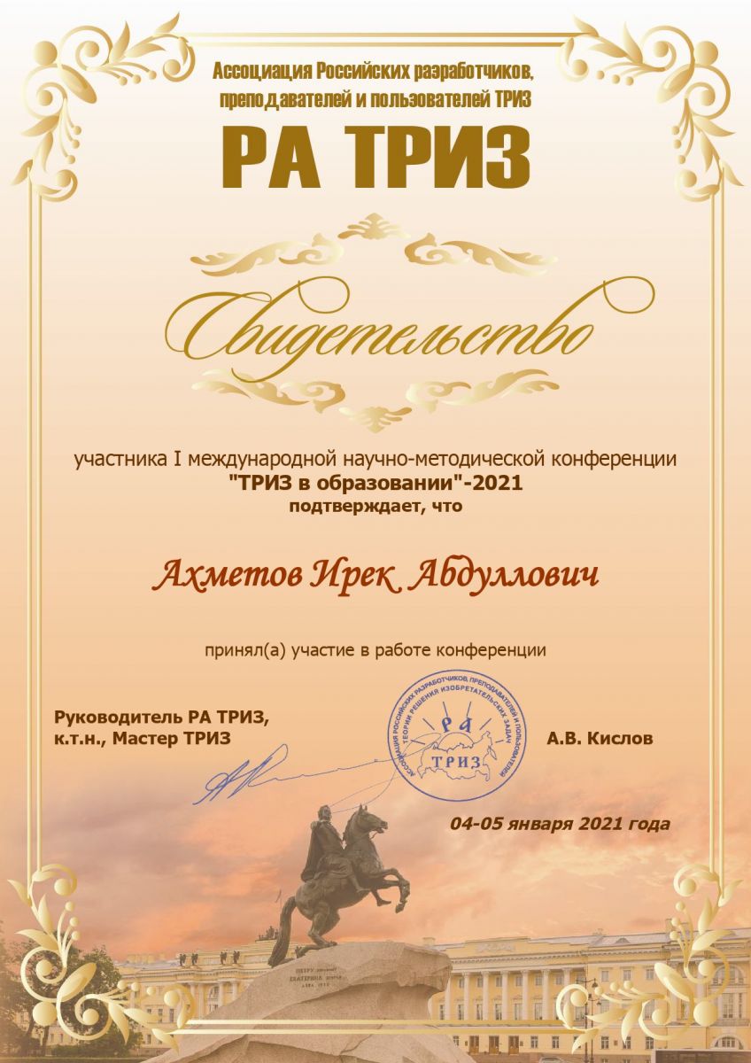 Опубликовано: 21.01.2021Поздравляем Ахметова Ирека Абдулловича с участием в I- ой международной научно-методической конференции "ТРИЗ в образовании"./upload/storage/org5336/files/Ахметов Ирек_page-0001.jpg
