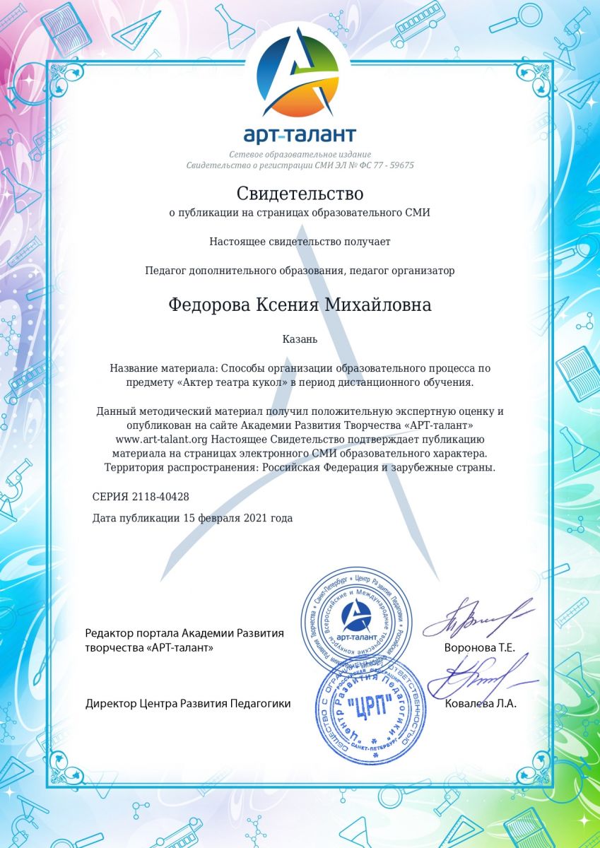 Опубликовано: 18.02.2021Педагог дополнительного образования, педагог организатор Федорова Ксения Михайловна получила свидетельство о публикации материалов на известим сайте «АРТ-талант» www.art-talant.org. На тему «Актер театра кукол» в период дистанционного обучения. Данный методический материал получил положительную экспертную оценку и опубликован на сайте Академии Развития Творчества Настоящее Свидетельство подтверждает публикацию материала на страницах электронного СМИ образовательного характера. Территория распространения: Российская Федерация и зарубежные страны.