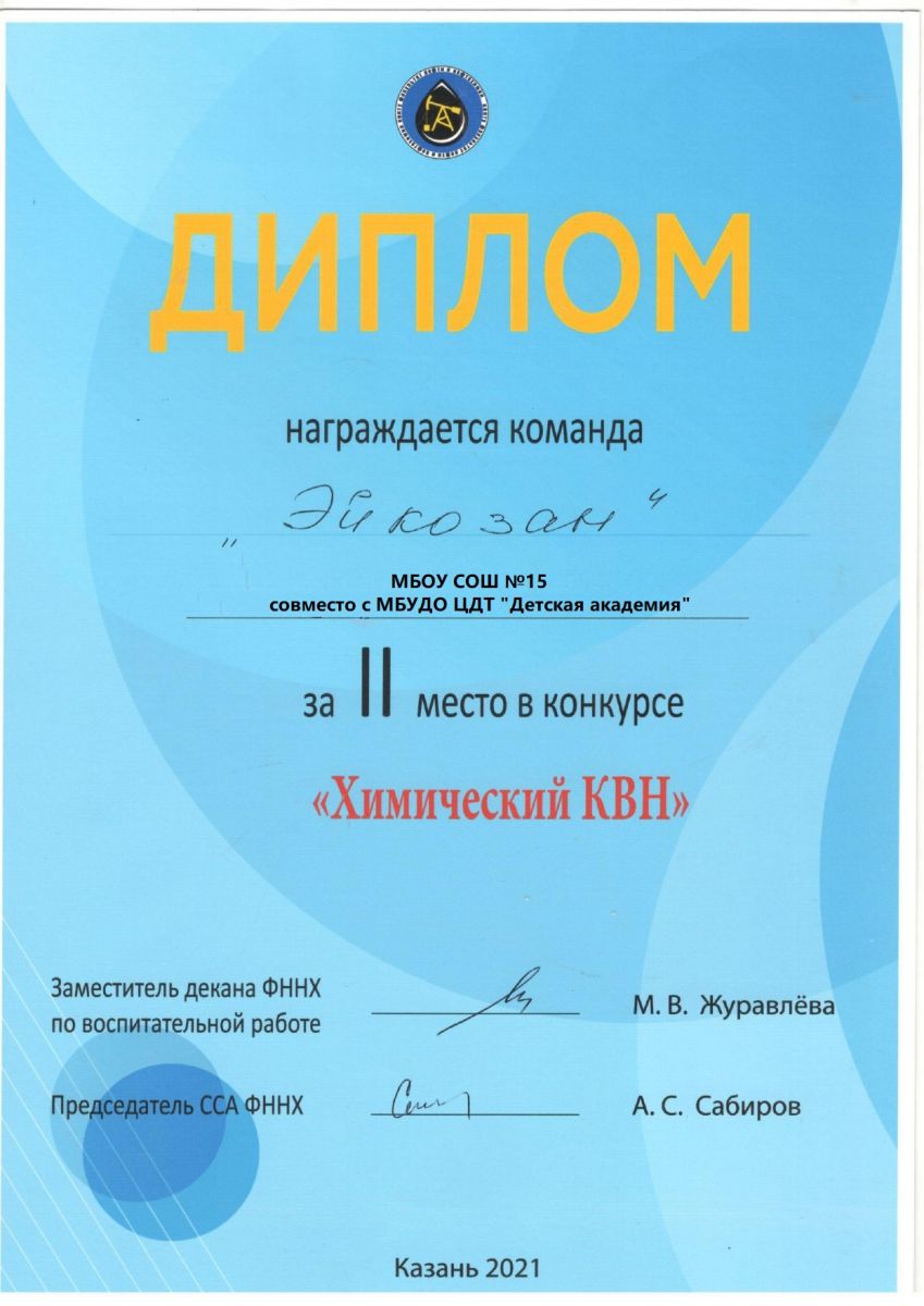 Опубликовано: 02.03.2021Обучающиеся школы компьютерной грамотности были награждены Дипломам за 2 место в конкуре «Химический КВН». Поздравляем ребят и педагога!