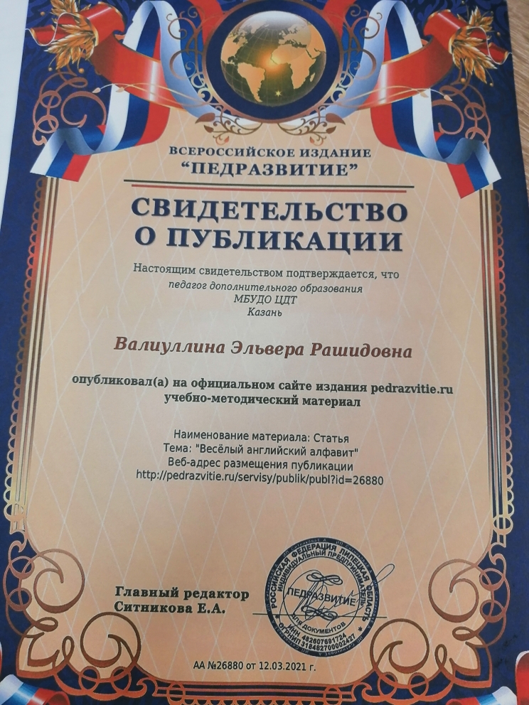 И так же Валиуллина Эльвера Рашидовна педагог дополнительного образования МБУДО ЦДТ "Детская академия" г.Казань является победителем Международного конкурса профессионального мастерства работников образования "Лучший открытый урок в соответствии с ФГОС" в номинации: "Сценарий урока/занятия". Название работы: "Введение в образовательную программу "Английский клуб".