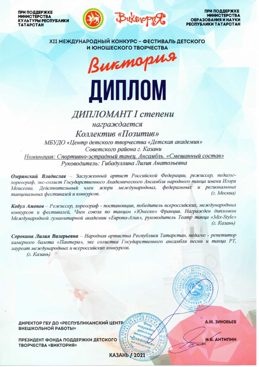 Опубликовано: 20.04.2021Обучающиеся хореографической студии коллектив «Позитив» принял участие в двенадцатом Международном конкурсе- фестивале детского и юношеского творчества «Виктория» и стали дипломатами первой степени. Поздравляем педагога Гибадуллину Л.А. и ребят с победой!
