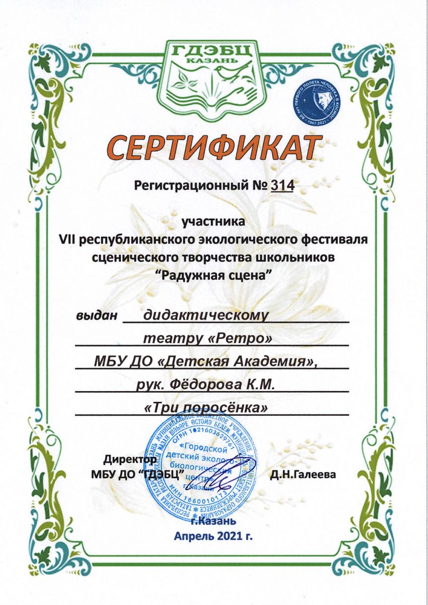 Опубликовано: 20.04.2021Обучающиеся дидактического театра «Ретро» приняли участие в седьмом Республиканском конкурсе сценического искусства «Театр как Театр» и были награждены дипломами третьей степени! Так же ребята были приглашены на выступление в «Городской детский эколого-биологический центр» г. Казани с кукольной постановкой «Три поросенка» и были награждены сертификатом. Поздравляем педагога Федорову Ксению Михайловну и ребят!