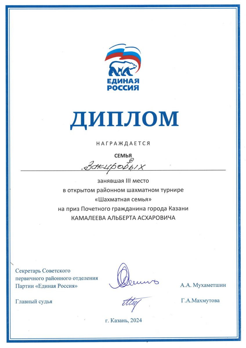 Поздравляем победителей районного турнира «Шахматная семья» на кубок Почетного гражданина г. Казани А.А. Камалеева семью Закировых (ЦДТ «Танкодром»), занявшую 3 место. Турнир прошел 13 апреля 2024г. в ЦДТ «Азино».