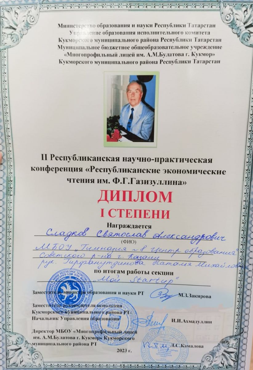 15 декабря 2023 года в г. Кукмор состоялась II Республиканская научно-практическая конференция "Республиканские экономические чтения им. Ф.Г. Газизуллина". Учащиеся объединения по экологии ЦДТ "Танкодром" заняли: Сладков Святослав 1 место, Приходько Виктория 3 место в секции "Мой Startup". Поздравляем!