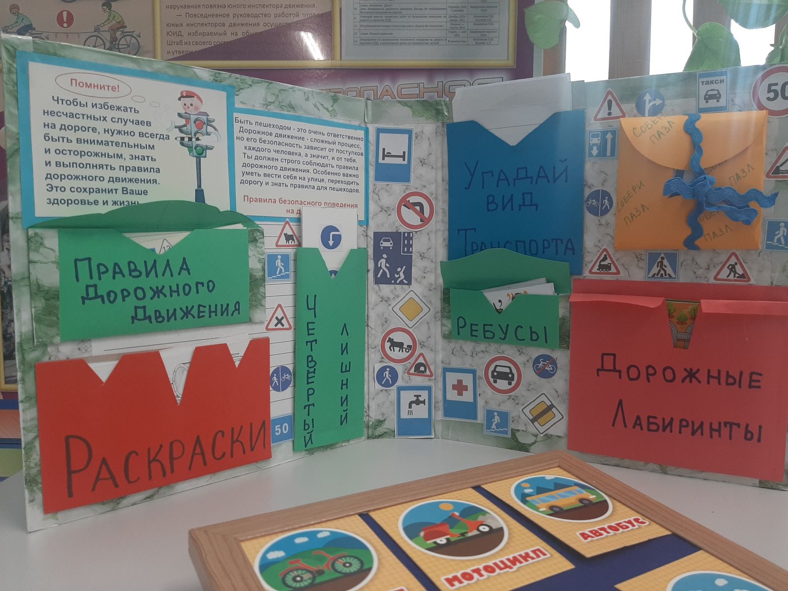 Для ребят, родителей и педагогов подготовлены памятки и игры. Ребята могут в перерывах между занятиями поиграть на настольной игровой площадке и в процессе игры вспомнить правила дорожного движения.