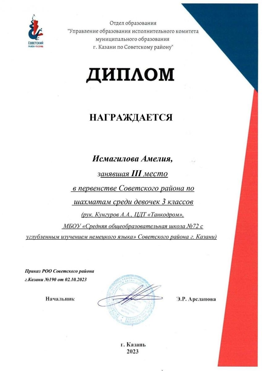 28 сентября 2023г. в ЦДТ "Азино состоялись районные соревнования "Шахматы и я" по Советскому району среди девочек 3 классов. В соревнованиях участвовали учащиеся объединения "Шахматные уроки" и "Шахматная страна" ЦДТ "Танкодром". Учащаяся Исмагилова Амелия (рук. Кунгуров А.А.) заняла 3 место. Поздравляем!