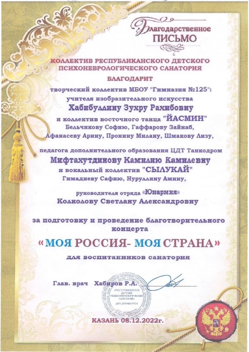 8 декабря 2022г. прошел благотворительный концерт "Моя Россия - моя страна" в Республиканском детском психоневрологическом санатории ко Дню героев отечества! В концерте приняли участие вокальный коллектив "Сылукай" (рук. Мифтахутдинова К.К.).