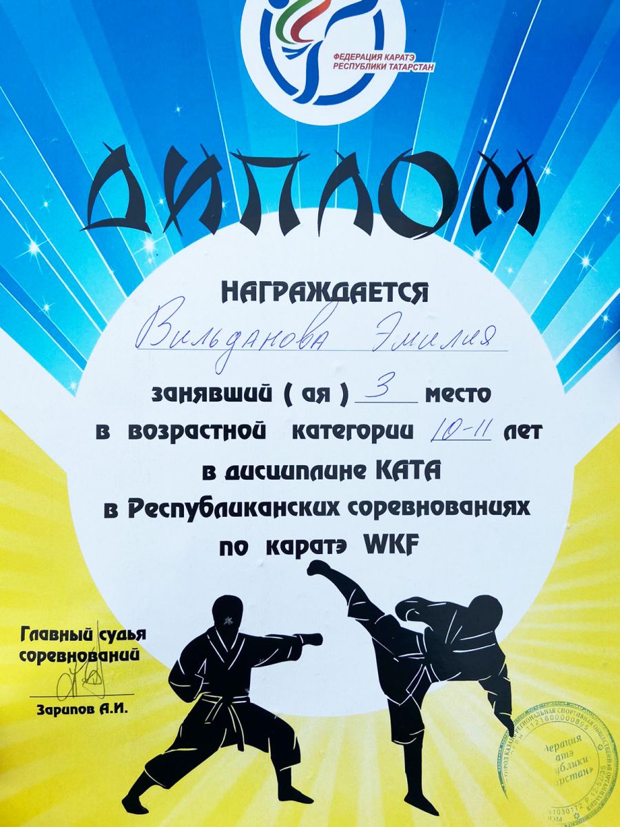 Поздравляем победителя Республиканских соревнований по каратэ! Вильданова Эмилия получила 3 место в дисциплине КАТА. Преподаватель Осипова Людмила Алексеевна.
