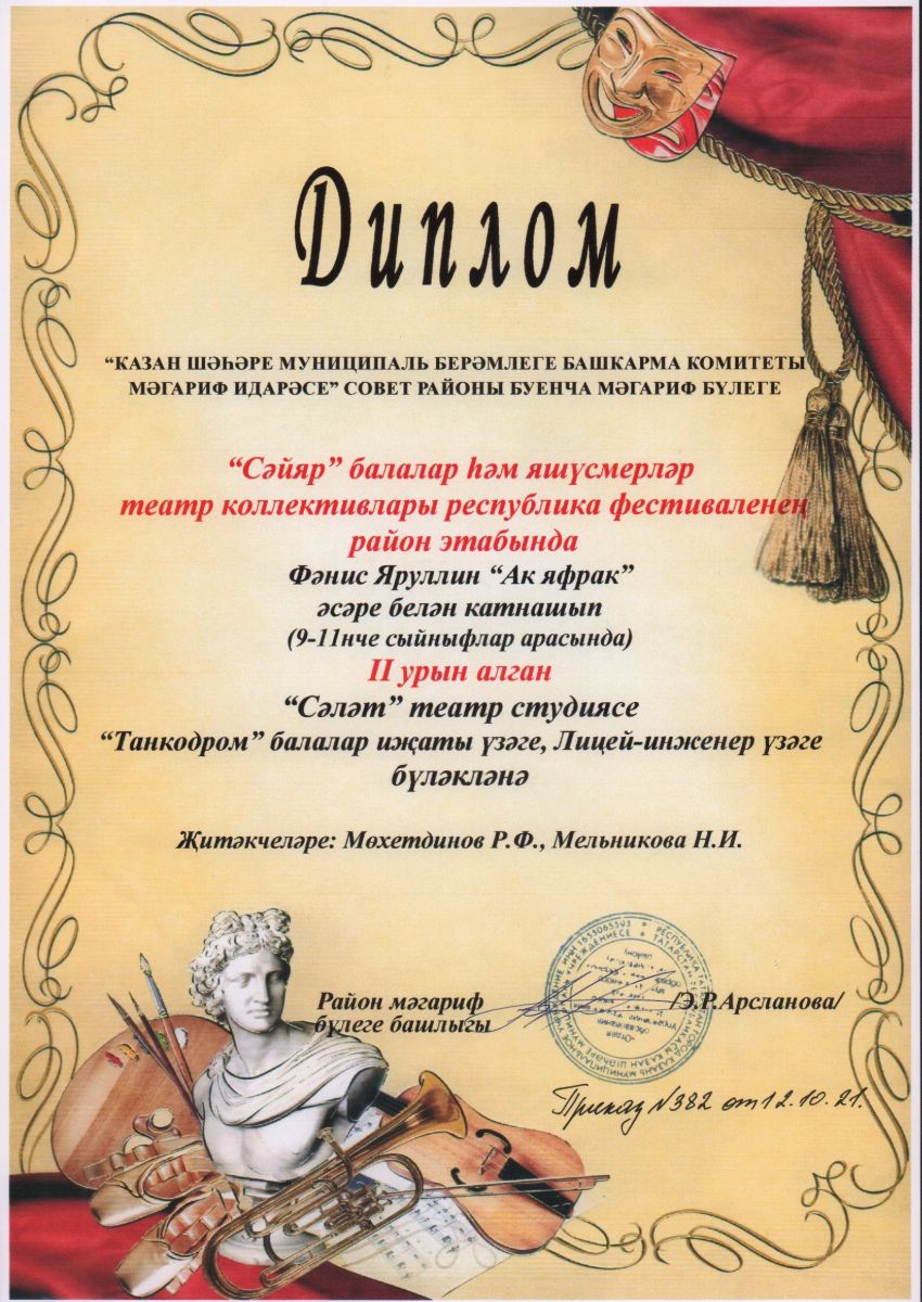 По результатам итогов районного этапа городского конкурса "Татар егете, татар кызы 2021", который проводился 26 октября в "ЦДТ Танкодром" победителями стали: Сафиуллин Булат, Галиева Айназ, Алимова Айзиля, Фатхиева Алина.