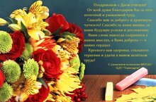 Поздравляем с Днем учителя! От всей души благодарим Вас за этот почетный и уважаемый труд. Спасибо вам за доброту и душевную чуткость! Спасибо за наши знания, за наши будущие успехи и достижения. Ваши слова навсегда сохранятся в наших мыслях, а Ваша доброта — в наших сердцах. Крепкого вам здоровья, стального терпения и удачи в вашем нелёгком труде!