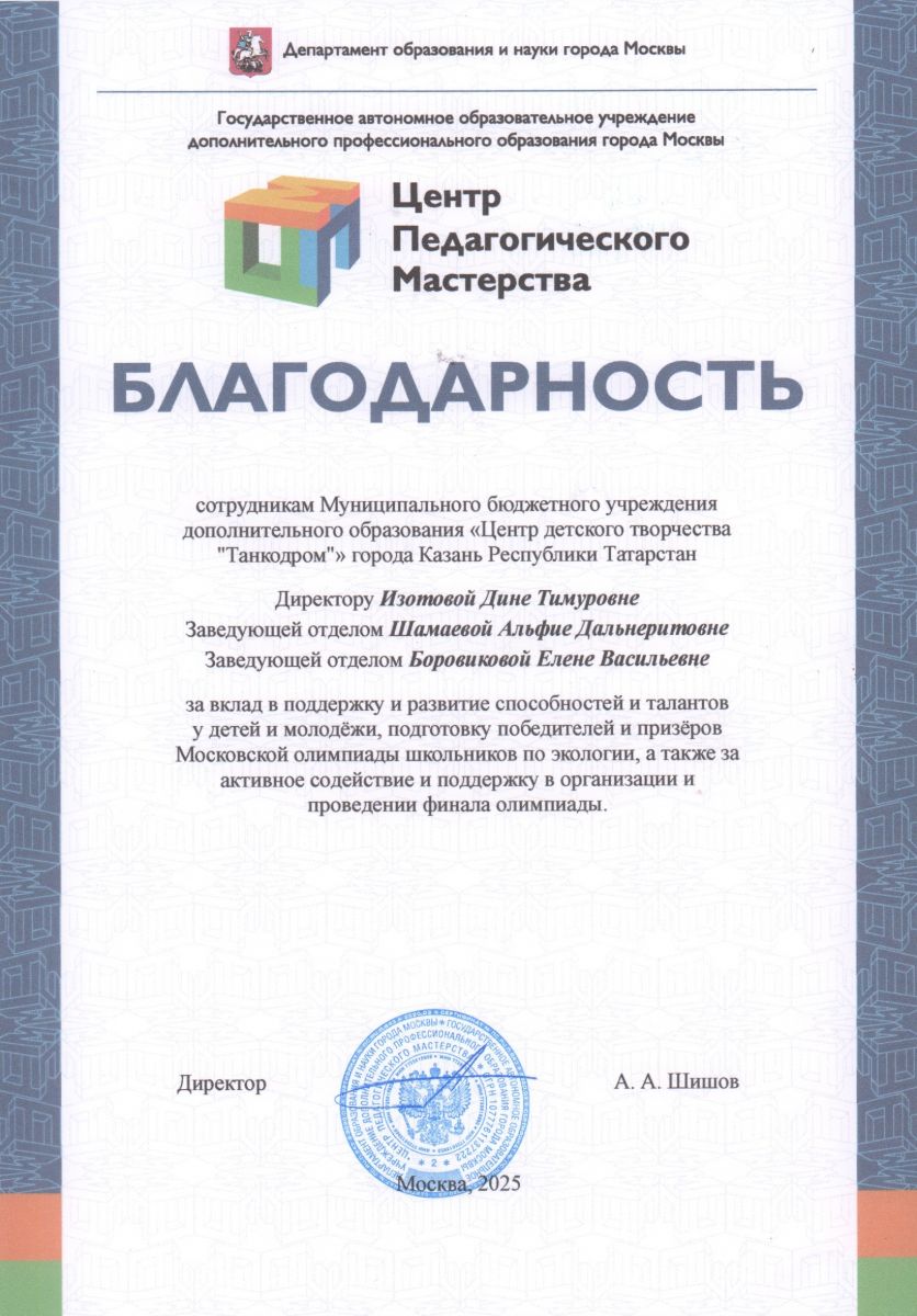 Огромное спасибо нашим замечательным педагогам центра за вклад и развитие способностей и талантов у детей. Отдельное спасибо нашему Центру экологического образования ЦДТ "Танкодром" за организацию и проведение на высоком уровне заключительного этапа Московской олимпиады школьников.