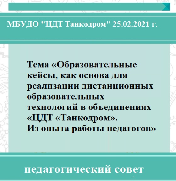 В МБУДО "ЦДТ Танкодром" 25.02.2021 г. прошел педагогический совет на тему «Образовательные кейсы, как основа для реализации дистанционных образовательных технологий в объединениях «ЦДТ «Танкодром». Из опыта работы педагогов». Со всеми материалами можно ознакомиться по ссылке.