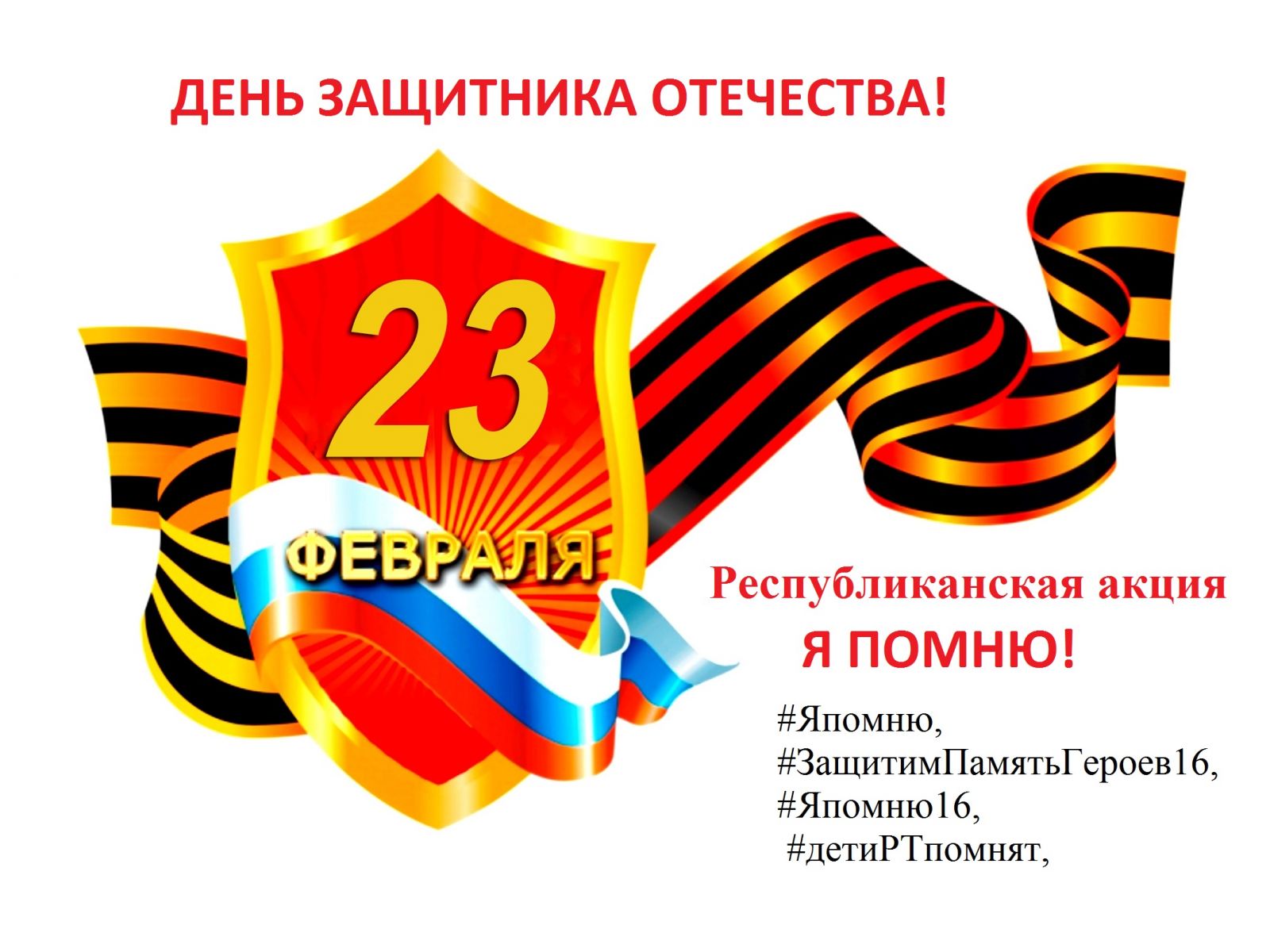 Уважаемые ребята, родители и педагоги!В преддверии праздника 23 февраля - Дня Защитника Отечества приглашаем присоединиться к Республиканской акции "Я помню!". Участники могут прочитать любое литературное произведение (стихотворение, часть рассказа, повести и т.д.) по тематике акции и поместить видеоролик в социальные сети Instagram и ВКонтакте под хештегами: #Япомню, #ЗащитимПамятьГероев16, #Япомню16, #детиРТпомнят.