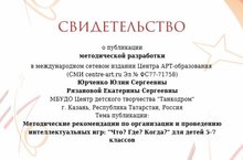 В целях развития творческой инициативы педагогических работников по учебно-методическому обеспечению образовательного процесса; стимулированию профессионального роста педагогических работников, их методического мастерства, потребности в исследовательской деятельности; обобщения методических и дидактических материалов, способствующих повышению качества образовательного процесса, педагоги организаторы Юрченко Ю.С. и Рязанова Е.С. приняли участие в Международном кокнурсе методических разработок и получили возможность опубликовать свою работу на сайте Центр АРТ-образование.