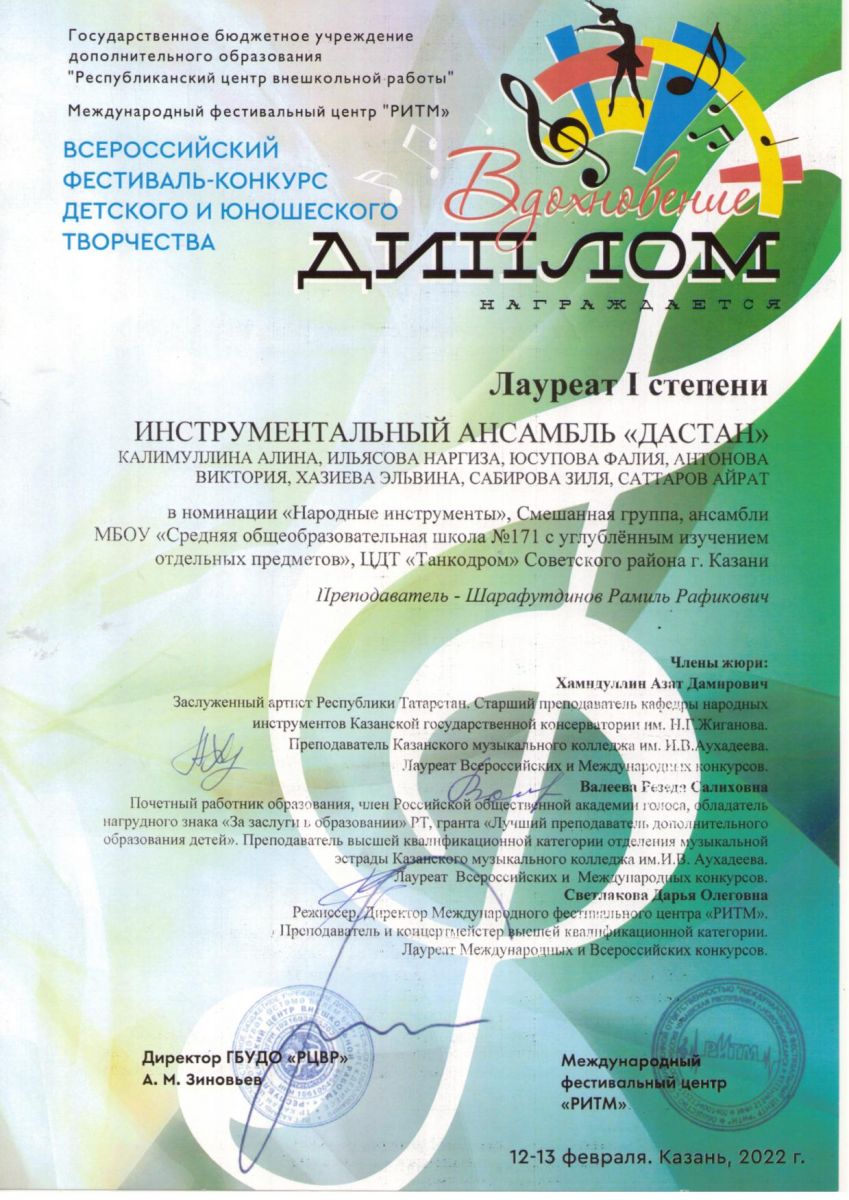 Опубликовано: 14.02.2022Поздравляем победителя Всероссийского конкурса детского и юношеского творчества «ВДОХНОВЕНИЕ» - Инструментальный ансамбль "Дастан"! Конкурс, в номинации «Инструментальное исполнительство» проходил в МБУДО «ДШИ №15» г. Казань, 13 февраля 2022г.