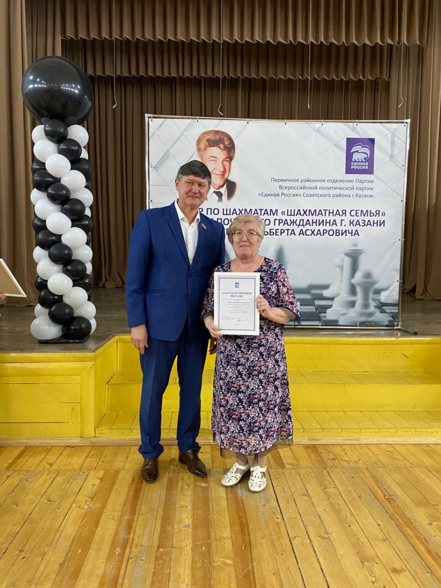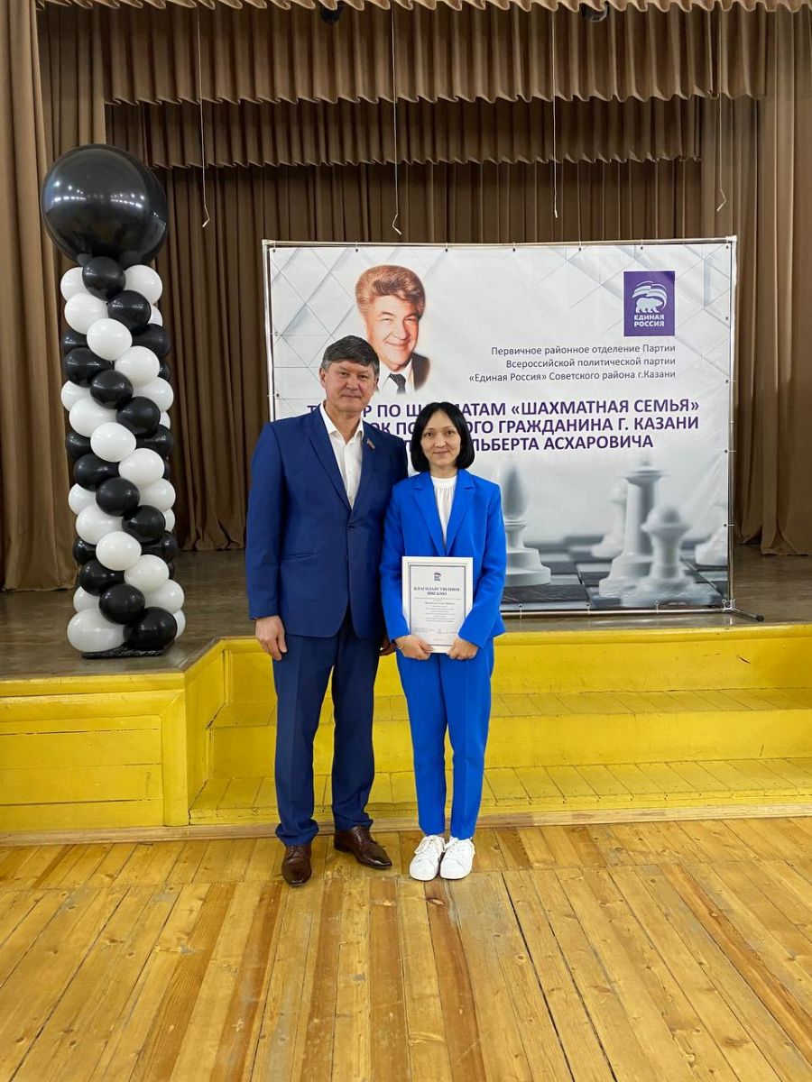 13 апреля 2024 в центре детского творчества «Азино», в рамках партийного проекта «Крепкая семья», состоялся районный турнир «Шахматная семья» на кубок Почетного гражданина г. Казани А. А. Камалеева. Турнир прошёл при поддержке Советского первичного районного отделения Партии «Единая Россия». Целью является - массовое привлечение детей и родителей к популяризации шахмат, формирование у детей склонности к систематическим занятиям шахматами. В турнире приняли участие депутат Государственного Совета Республики Татарстан, секретарь Советского первичного отделения Партии Альберт Мухаметшин, руководитель Общественной приёмной Партии "Единая Россия" по Советскому району Талия Ахметшина. Этот шахматный турнир особенный, в нем, вместе с детьми соревновались их родители, бабушки, дедушки. Самому младшему участнику Николаеву Александру - 7 лет, самому старшему Баязитову Рафику - 82 года. В турнире приняли участие 21 команда. Победителями турнира стала семья Махмутовых (ЦДТ «Азино»). II место заняла семья Шархемуллиных (Гимназия №174). III место заняла семья Закировых (Школа №144, ЦДТ «Танкодром»). Всем участникам турнира вручены медали, дипломы об участии и памятные подарки. Поздравляем!!!
