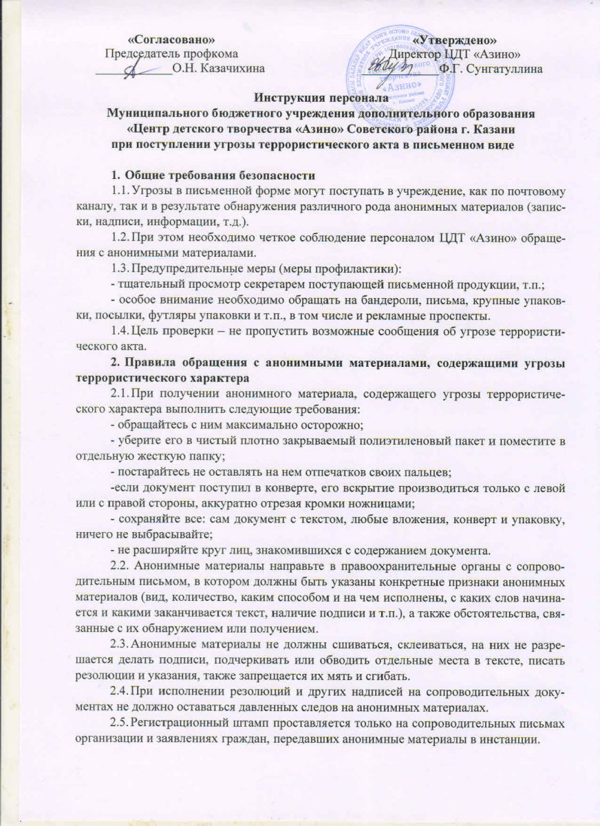 Инструкция персонала при поступлении угрозы террористического акта в письменном виде