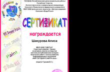 Воспитанница объединения "Мир вокруг нас" Шакурова Алиса (пдо Гурьева В.С.) награждена сертификатом за активное участие в открытом заочном республиканском конкурсе творческих работ с использованием информационных технологий "Мир сегодня и завтра - 2014"