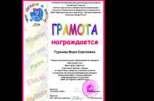 Педагог дополнительного образования Гурьева Вера Сергеевна награждена дипломом за подготовку учащихся и за активное участие в открытом заочном республиканском конкурсе творческих работ с использованием информационных технологий "Мир сегодня и завтора - 2014"