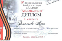Замалиева Алия (объединение "Литературное краеведение") награждена Дипломом 2 степени в IV Всероссийском конкурсе чтецов им.Г.Тукая "Джалиловцы".