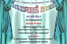 По итогам экологического фестиваля "Солнечный мост", воспитанник СДЮТиЭ - Юрий Белов был награжден дипломом лауреата за III место в номинации "Художественное слово" (руководитель - Мурдасова Ю.В.). ПОЗДРАВЛЯЕМ!