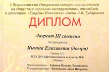 С 9 по 12 января 2018 г. в г. Дзержинске прошел I Всероссийский Открытый конкурс исполнителей на струнных народных инструментах, ансамблей и оркестров "Струны Поволжья" им. А.В. Губарькова. В номинации "Домра. Соло" званием Лауреата III степени была удостоена Яшина Елизавета (кл. Зайцевой К.Л.), а также обладателем Гран-при стала Зайцева Ксения Леонидовна в составе ансамбля "Креатив-квинтет" и званием Лауреата I степени была награждена Марина Олеся Анваровна (преподаватели по классу домры). Председатель жюри конкурса - профессор Астраханской консерватории, Заслуженный деятель искусств России А.В. Мостыканов,а среди членов жюри присутствовали профессора Нижегородской, Саратовской, Казанской консерваторий.