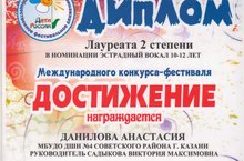 9 января в Академии спорта и туризма, прошел Международный конкурс-фестиваль "Достижение".Данилова Анастасия,учащаяся ДШИ №4,(класс преподавателя Садыковой В.М.) стала лауреатом 2 степени.Поздравляем!!!