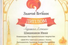 3 ноября в МБУДО "ДМШ №5" г.Казань прошел Открытый региональный конкурс детского творчества «Золотой петушок». Шишканов Иван (пр.Галлямова Э.Р.) - Лауреат III степени. Поздравляем!!!