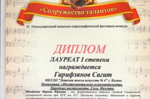 10-13 ноября в МБОУ ДОД г. Казани «Детская музыкальная школа № 4» состоялся VIII Международный конкурс - фестиваль исполнителей инструментальной музыки и академического пения «Содружество талантов». Гарифзянов Сагит Зигангареевич преподаватель нашей школы - Лауреат 1 степени в номинации "Маэстро". Хасанов Амир (пр.Марина Т.А.) - Лауреат II степени, Стальмахова Анна (пр.Марина Т.А.) - Лауреат III степени. Поздравляем!!!