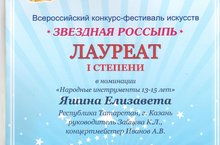 1 ноября во Дворце спорта Деревни Универсиады состоялся Всероссийский конкурс «Звездная россыпь». Яшина Елизавета (пр.Зайцева К.Л., конц. Иванов А.В.) стала Лауреатом I степени. Поздравляем!!!