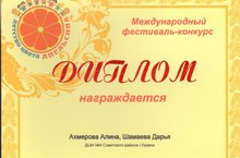 Поздравляем лауреатов Международного фестиваля-конкурса "Детство цвета апельсина": Дуэт Ахмерова Алина и Шамаева Дарья(пр.Гайдукова В.В.) - Лауреат III степени.