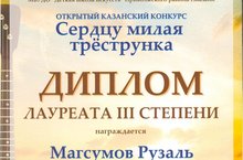 13 мая в ДШИ Приволжского района г.Казани прошел Открытый Казанский конкурс исполнителей на балалайке "Сердцу милая трех струнка". В конкурсе принимали участие солисты-балалаечники из разных школ Казани. Учащиеся класса балалайки под руководством преподавателя Усова А.А. заняли призовые места в конкурсе: Маслов Даниил - ГРАН-ПРИ, Усов Денис - Лауреат 1 степени, Хабибуллин Руслан, Магсумов Рузаль -Лауреат 3 степени, Володин Илья - Лауреат 3 степени, Дипломанты -Хуснулин Марсель ,Хабибрахманов Джамиль, Хабибуллин Евгений. Юнусов Тимур, Таллин Тимур - Лауреат 2 степени. Поздравляем!!!