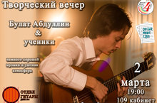 2 марта в в ДШИ №4 прошел творческий вечер "Булат Абдуллин и ученики" , посвященный 5 летию работы Булата Рафгатовича в качестве преподавателя в ДШИ №4. В концерте приняли участие солисты - учащиеся школы Спиридонова Даша, Акберов Арслан, Гасимов Наиль и др. Завершило вечер выступление вокально-инструментального ансамбля гитаристов (рук.Абдуллин Б.Р.) Концерт прошел в доброжелательной атмосфере.