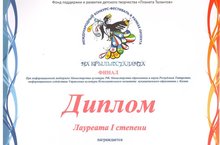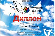 В Казани состоялся Всероссийский фестиваль-конкурс детского и юношеского творчества «Будущее России». Хуснуллина Аделя (пр.Никифорова Е.Е.) – Лауреат I степени в номинации «Композиция» 13-15 лет. Гимадеев Марсель ( пр Маликова А.Я.) - Лауреат I степени в номинации "эстрадный вокал", Лауреат II степени в номинации "Родной край" Поздравляем!!!