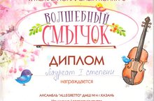 20 марта в Детской музыкальной школе г. Зеленодольска прошел Межрегиональный конкурс «Волшебный смычок».Учащиеся класса скрипки преподавателя Шакировой Е.Н., концертмейстер Кошкин А.А. : Гатина Нурия - Лауреат I степени , Фролова Милана - Лауреат I степени, Мухаммадиева Камила - Лауреат II степени, Мамяшева Радмила (пр.Карпова О.А., конц.Хамидов Р.Р.) - Лауреат II степени, Ансамбль струнно-смычковых инструментов "Аллегретто"(пр.Карпова О.А., конц.Хамидов Р.Р.) - Лауреат I степени. Поздравляем!!!